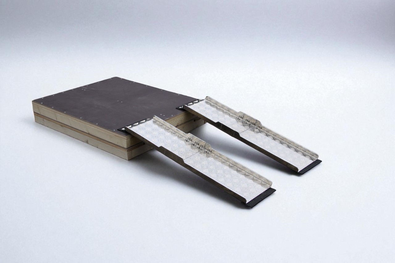 Für Rollstuhlfahrer ist das häufigste Hindernis eine Stufe oder Schwelle. Deshalb haben wir die doppelt faltbare Rampe entwickelt mit der sich Stufen UND Schwellen sowie Rinnen und Gräben überwinden lassen.